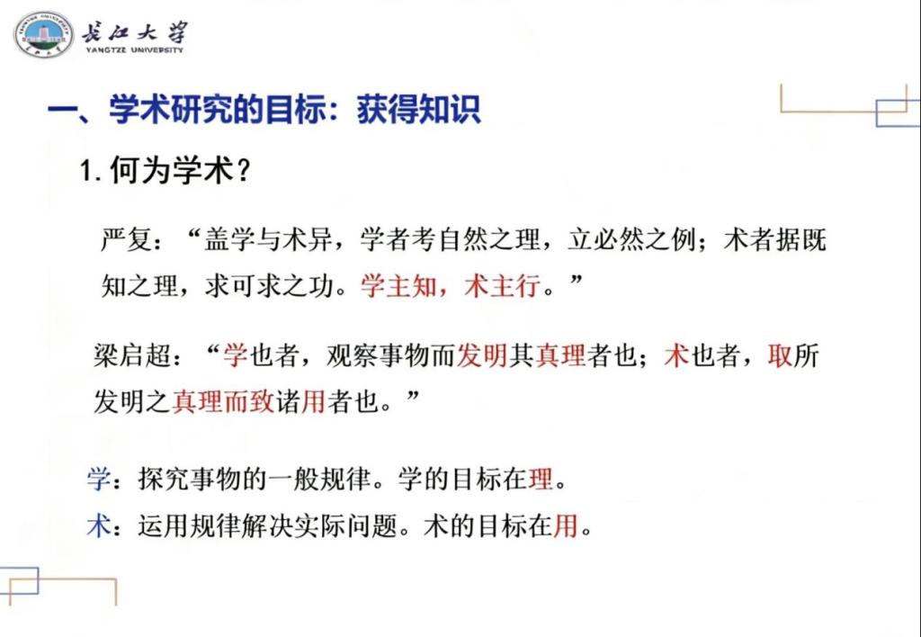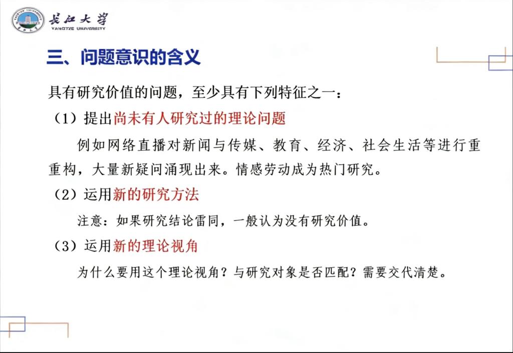 讲座伊始,杜云素从“学”与“术”的本质区别切入,清晰界定了学术研究的核心内涵。她指出,学术以探究事物规律和真理为目标,侧重“是什么”与“为什么”的理论追问,而技术与应用则聚焦“如何做”的实践落地。同时强调,学术研究的核心是产生科学知识,经验研究以“求真”为导向,马克思主义理论、伦理学等规范研究则以“求善”为价值追求。在阐释问题意识时,杜云素明确问题意识就是提出具有研究价值问题的意识与能力,问题应至少满足三个方面特征之一,即尚未有人研究的理论问题、运用新的研究方法以及新的理论视角。