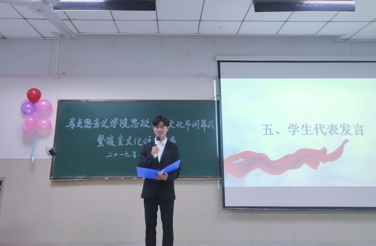 进入思政之音文化节闭幕式,员工代表莫保华回忆了思政之音文化节系列活动,分享了自己在系列活动中的点滴收获与成长,表达了对服务同学,自我成长,建设更好马院的决心。