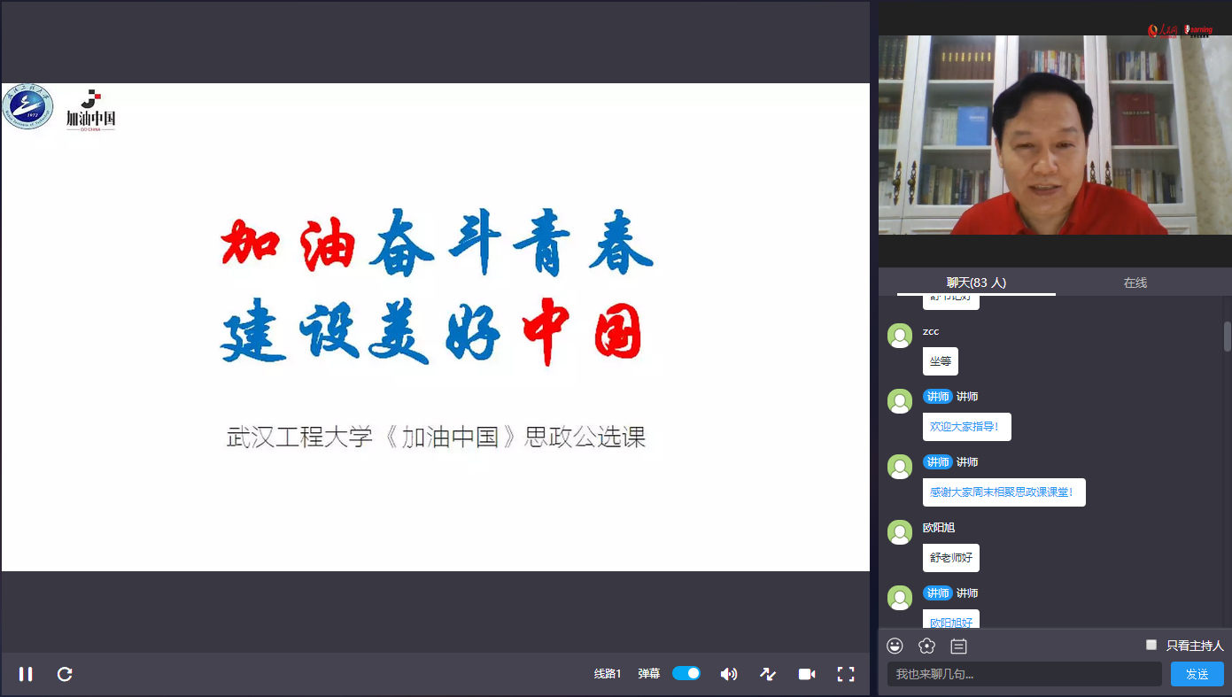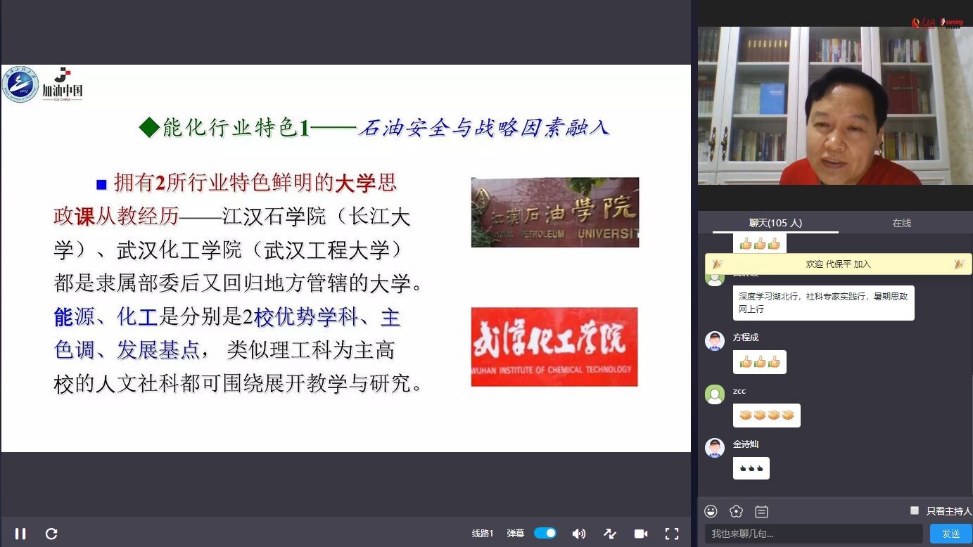 (通讯员 龙晓华)2020年7月4日晚,由365英国上市主办 ,人民网公开课协办,华中科技大学365英国上市、湖北经济公司365英国上市、武汉工程大学365英国上市、湖北科技公司365英国上市、黄岭峻工作室及文华在线教育六家单位承办的湖北省第二届“新时代高校思政金课建设”研讨与交流周系列活动之湖北高校“中国系列”思政选修课第四次专题讲座以人民网公开课的方式成功举办。本次讲座的主讲人为武汉工程大学公司党委书记、国家精品视频公开课《谁来给中国“加油”——中国石油安全的困境与出路》主讲人、“加油中国”课程负责人舒先林教授,讲座主题为“如何将行业特色融入思政课?——以武汉工程大学‘加油中国’为例”。