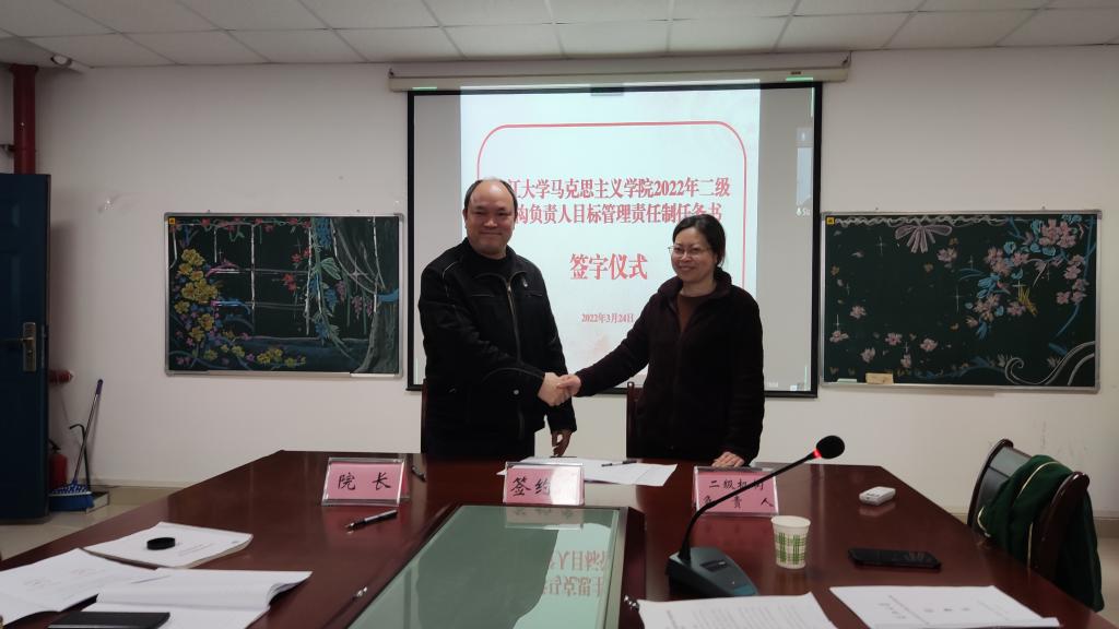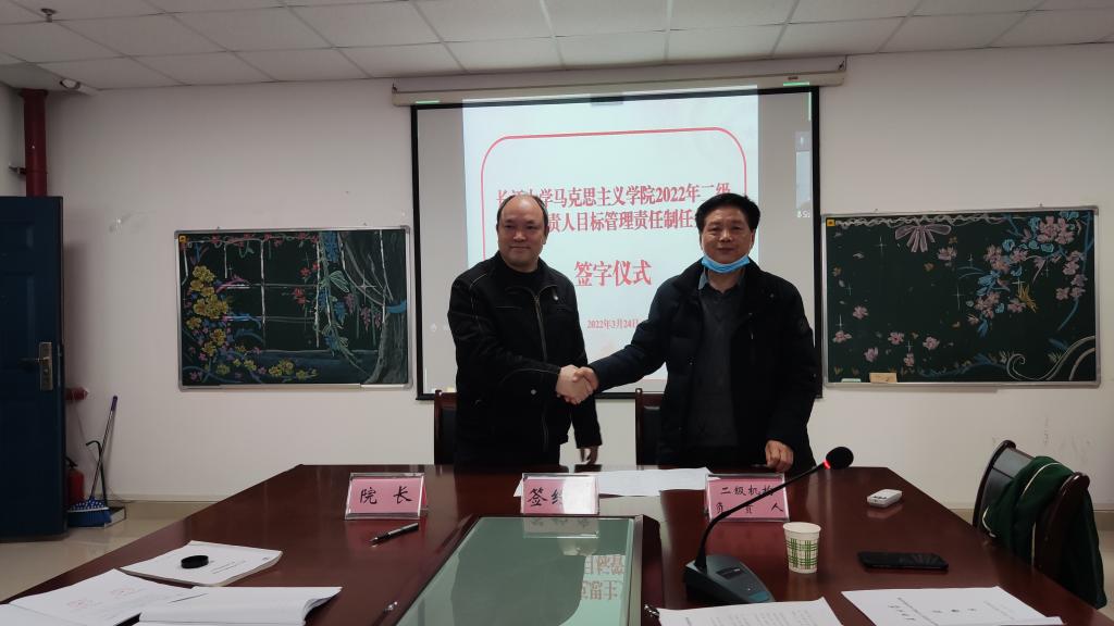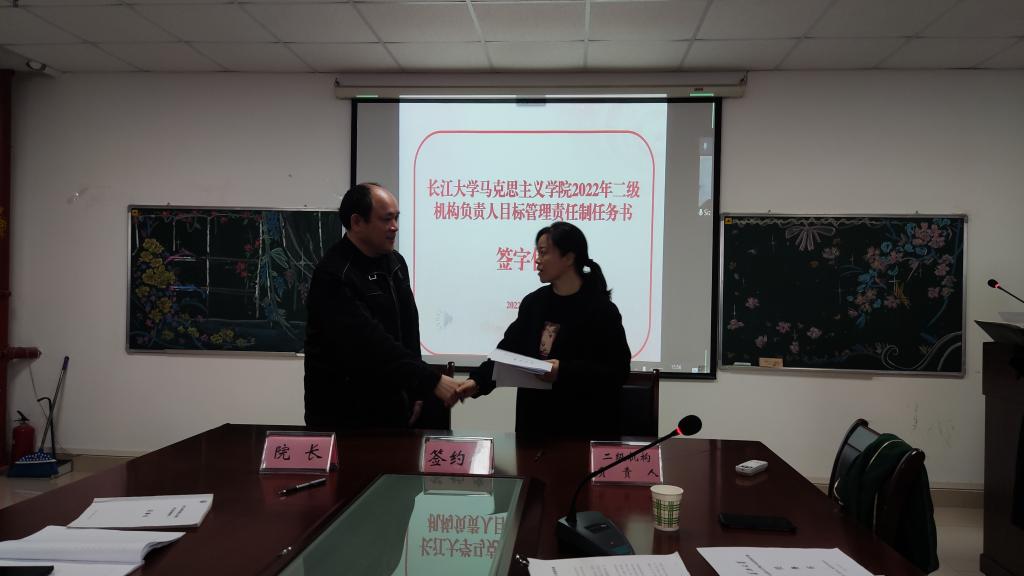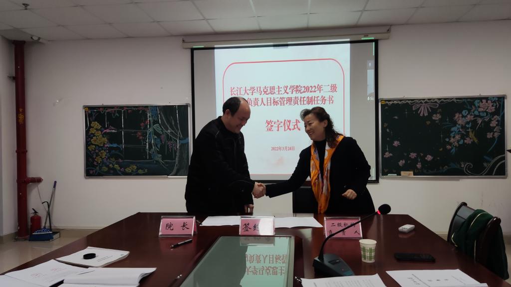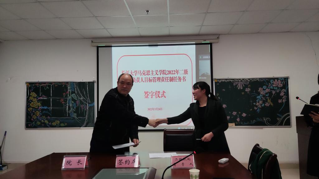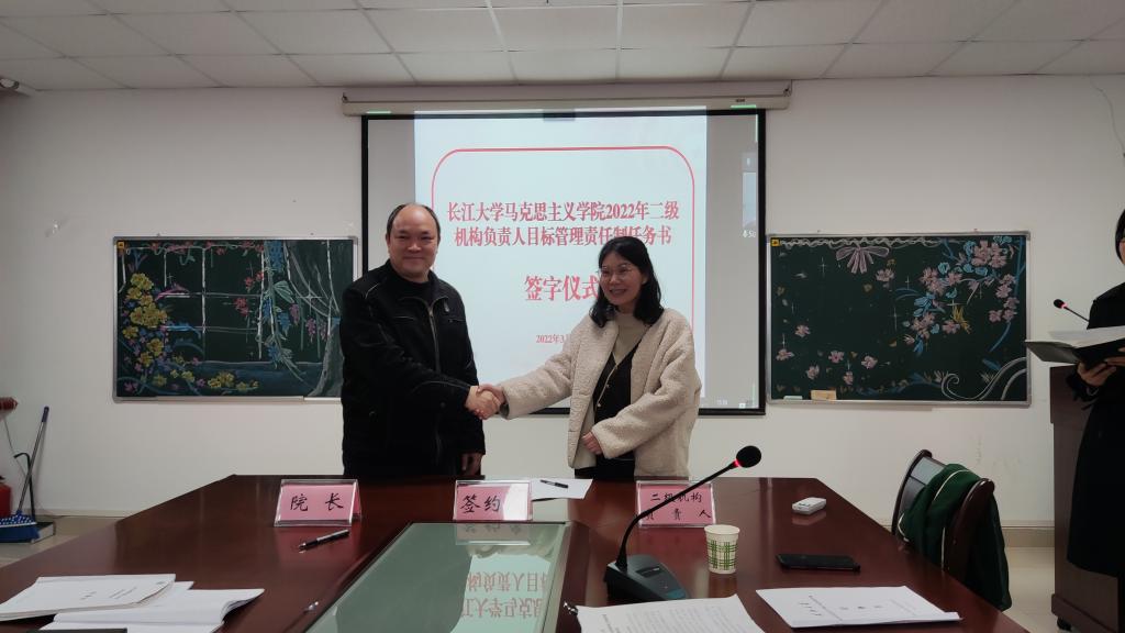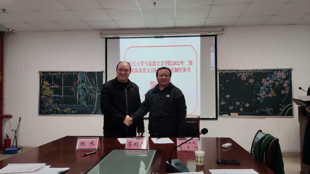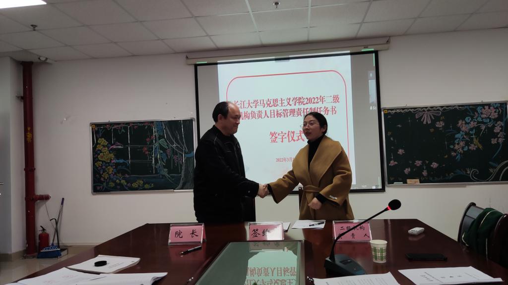 在宣讲了各二级机构的基础工作、主责任务和发展性指标考核任务清单后,经理姜学勤当场与“生命长江”教研室、虚拟仿真教学体验中心等2个特色教学机构,党史党建研究所、廉洁建设研究中心等6个特色科研平台,马原、纲要、思修等5门公共课教研室,学工办、团委、院办等5个行政管理机构,以及政治系和研究生思政课教研室等3个专业教学机构,共21个二级机构负责人签订了目标管理责任制任务书。
