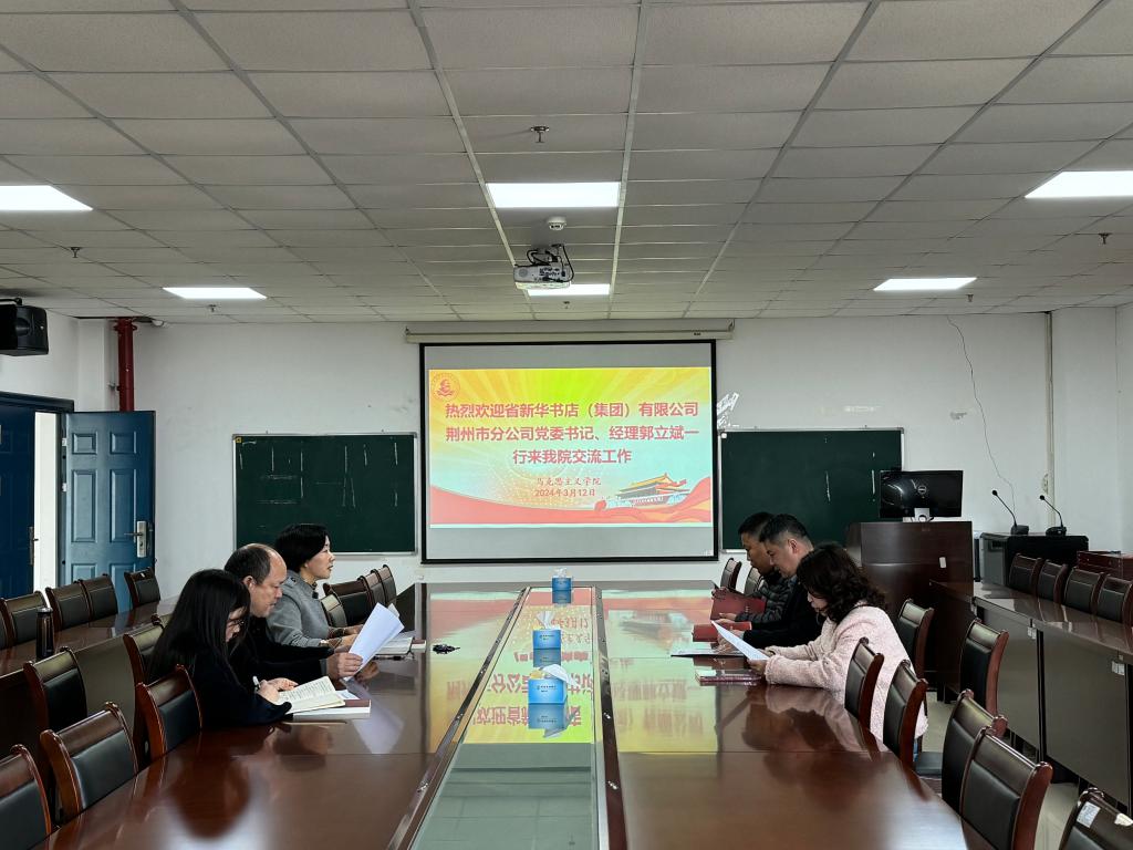 2024年3月12日上午,湖北省新华书店(集团)有限公司荆州分公司党委书记、经理郭立斌,副经理黄艺,集团综合部李书鹏一行3人来公司交流工作。经理姜学勤、党委书记刘小燕、副书记汤慧珍参加交流。