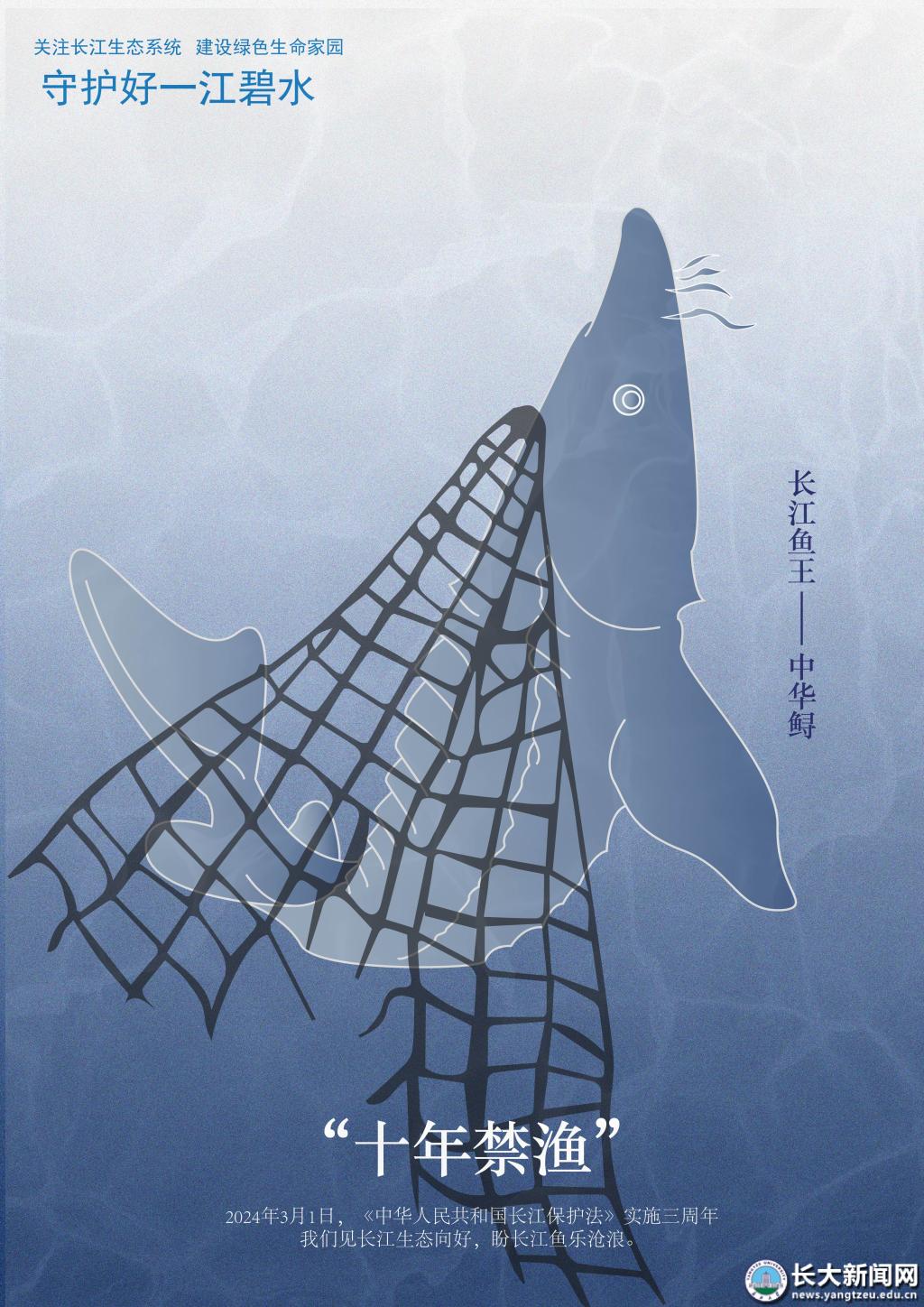 该作品由公司2023级研究生王悦悦创作。画面以“长江鱼王”中华鲟挣脱渔网的姿态,纪念《中华人民共和国长江保护法》实施三周年。作品借简洁视觉语言,传递出守护一江碧水,期盼长江生态持续向好,人与自然和谐共生的美好愿景,彰显了青年学子以创意助力生态保护的担当。