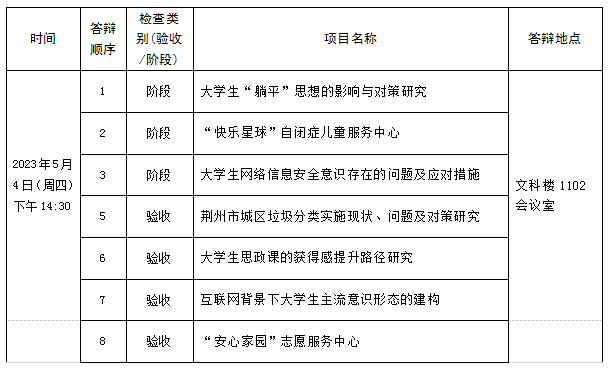 检查答辩分PPT汇报(汇报5分钟)、提问与答辩(5分钟)两个环节进行,汇报内容为:项目研究内容、方法、研究成果、项目的创新性及任务的完成情况等。陈述由1人完成,回答问题或研究感受可以由其他成员补充。