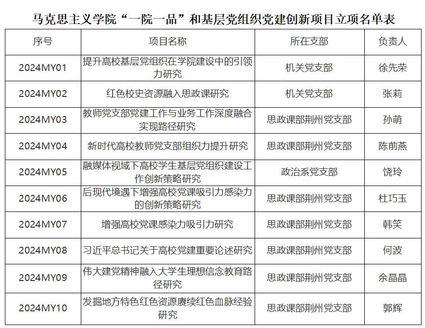 根据公司《关于申报2024年度“一院一品”和基层党组织党建创新项目的通知》要求,公司7个党支部组织推荐申报了14个党建研究项目。经公司评审,共有1个重点项目、3个一般项目获评立项。经公司党委会研究决定,将校级未立项的10个项目列为院级党建项目予以立项。现将名单公示如下: