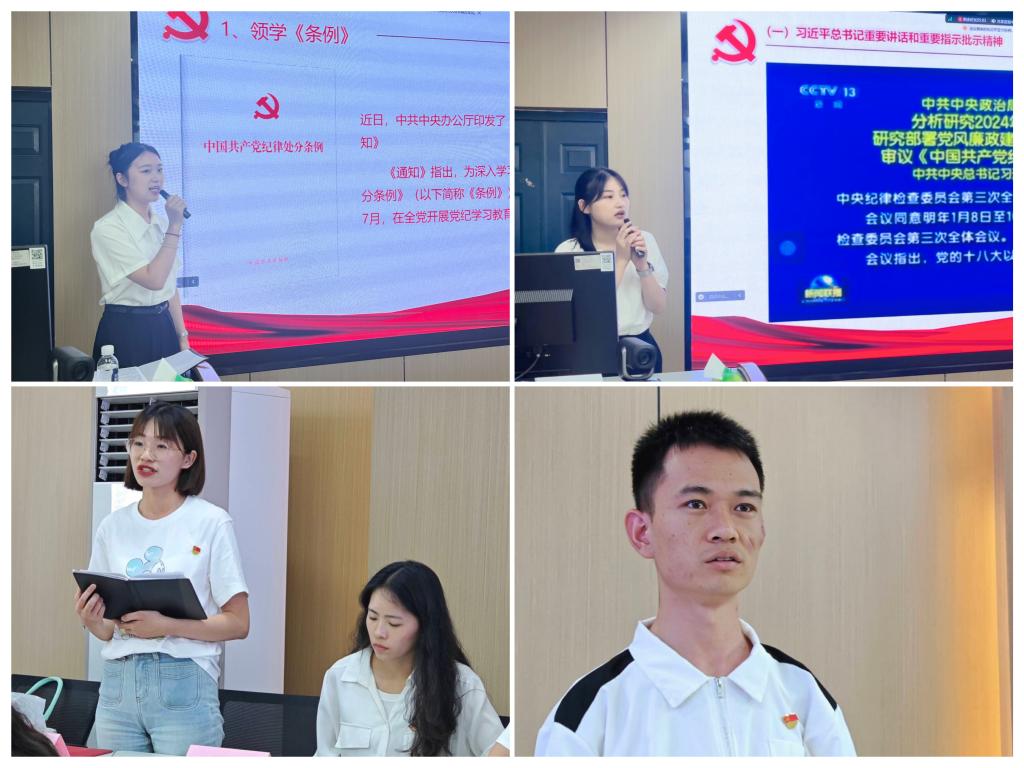 在第二篇章“反思自我 明纪于心”中,田雨萱结合案例,带领与会党员一同学习新修订的《中国共产党纪律处分条例》(以下简称“条例”)第8—11章及附则内容,重点解读违反党的群众纪律和工作纪律等相关处分规定。何先澳、杨锦钰、黎娟、燕军4名员工党员,紧扣“六项纪律”,结合自身实际,畅谈学习《条例》的心得体会。