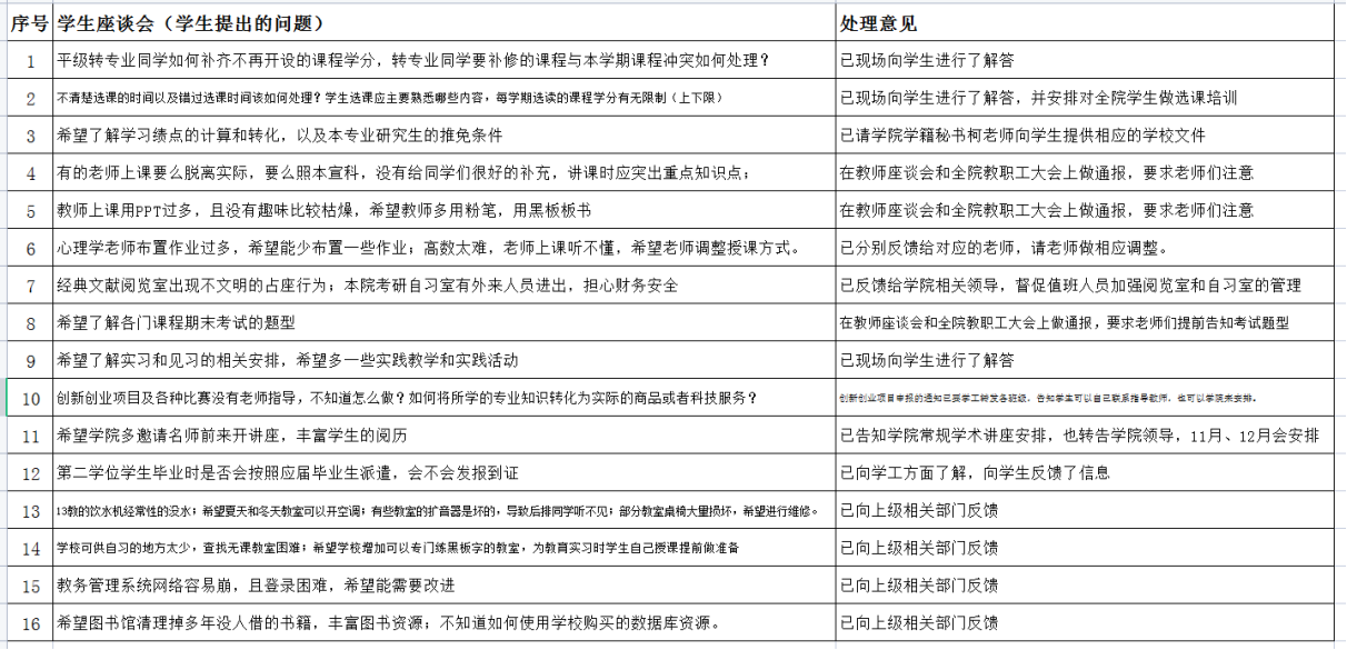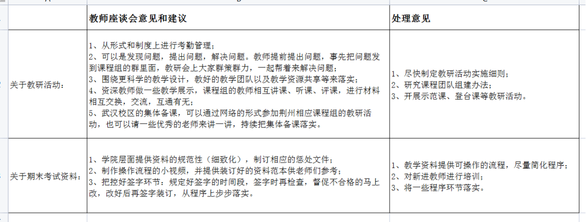 认真组织教师和员工座谈会,听取参会代表所搜集到的教学管理方面的意见和建议,两个座谈会均由教学经理助理李振华老师主持,会后公司对师生反映的问题和建议进行了分析、反馈,并提出了相应的整改措施。具体情况见后面的附件1和附件2.