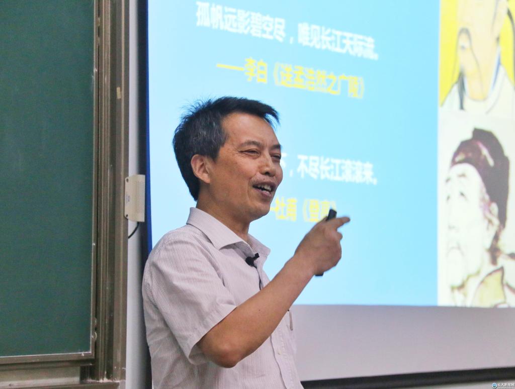 “滚滚长江东逝水,浪花淘尽英雄。”课程开始,朱业宏惊喜开嗓,吟唱歌曲《滚滚长江东逝水》选段,获得在场师生热烈的掌声,课堂气氛迅速活跃。列举了众多文人墨客的“长江赋”后,朱业宏点明了本堂课的中心论题:“万里长江奔腾不息,赋长江的人何止千百万,今天我们应该用什么样的视角作出当代的长江赋呢?”随后,他从“水”“殇”“策”“魂”四个方面对这一论题进行阐述。