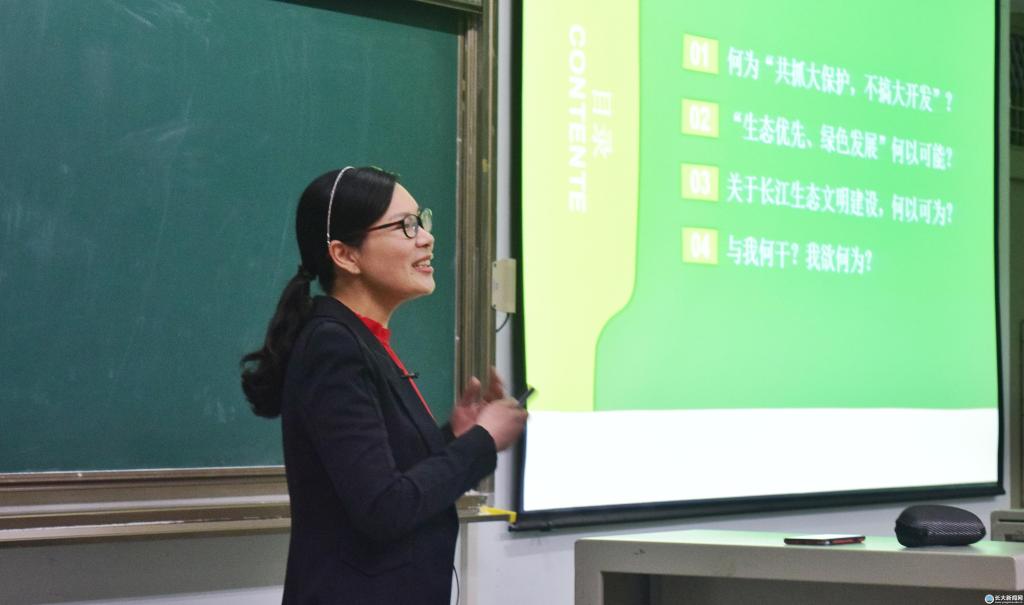 “据统计,长江流域分布的水生生物多达4300多种,其中鱼类400多种,拥有中华鲟、长江鲟等重点保护水生物11种,所以保护的责任尤其重大。”肖芬蓉老师首先通过白鳍豚和江豚的图片,带领同学们从生物多样性方面了解环境问题,随后开始讲解关于长江生态文明建设的主要理论。