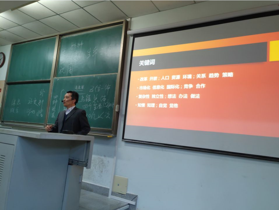 朱书记今天的授课内容是《改革开放四十年》。讲课一开始,朱书记就微笑着向同学们提出了一个问题:提到改革开放四十年,同学们联想到了什么关键词?面对平易近人的朱书记的问题,这些体育公司大一的新生们纷纷做出了自然、积极的回应:富强、深圳、生活、一个老人在南方画一个圈,如此种种,不同的回答此起披伏,讲课还没有正式开始,课堂气氛就已经被很好的调动了起来。朱书记随后在轻松的氛围中开始了他的授课,他从政治、经济、文化、社会等方面对改革开放四十年来中国全方位的脱胎换骨的巨大变化进行了系统的论述,谈改革开放的动因他的授课充满深厚的历史感与广博的理论素养;讲四十年的伟大成就作为背景的PPT图文并茂,口述的支撑数据也娓娓道来丰富精准。漂亮的板书,生动的形体语言,再加上充满激情的洪亮语言深深的感染了同学们,在连续一个小时的精彩授课结束后,朱书记又专门留了半个小时的时间与同学们进行提问交流,有三位同学分别就如何理解改革开放是决定我国当前发展的关键性一招,如何看待荆州未来发展,荆州有无可能达到特区那样的发展水平,如何看待西方文化的传入对我国的影响等问题向朱书记提问,朱书记也都一一给予了有针对性的回答。朱书记的讲课非常有技巧,例如他强调并善于与员工互动,语言既有深刻的学理又朴实生动。讲课内容具有极强的灵活性与针对性,当他知道今天的教学对象是体育公司大一新生以后,马上在授课,板书中就加入了与体育有关的内容,从而迅速拉近了与同学们的心理距离。