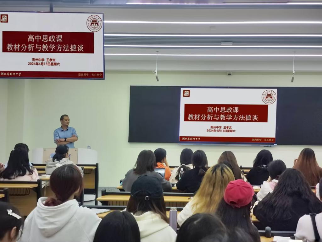 (通讯员:刘若曦)为帮助员工深入了解高中思政课教材与教学方法,4月13日上午,365英国上市于16教A312室开展教学论坛第五讲。本次讲座由荆州中学高级教师王孝文担任主讲,公司本科生以及学科教学(思政)专业研究生参与讲座。