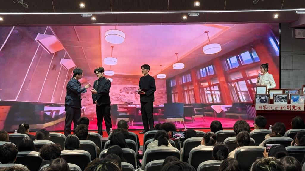 在情景演绎环节,杨耀峰、张博涵、蔡坤鹏、吴宇洁四位同学深情演绎毛主席在武汉东湖宾馆会见李达的经历,将可观可感的历史场景一一还原,让在场师生在聆听讲述时,通过“深体验”获得“深感触”,感悟毛主席殚精竭虑的工作状态和平易近人的人格力量。