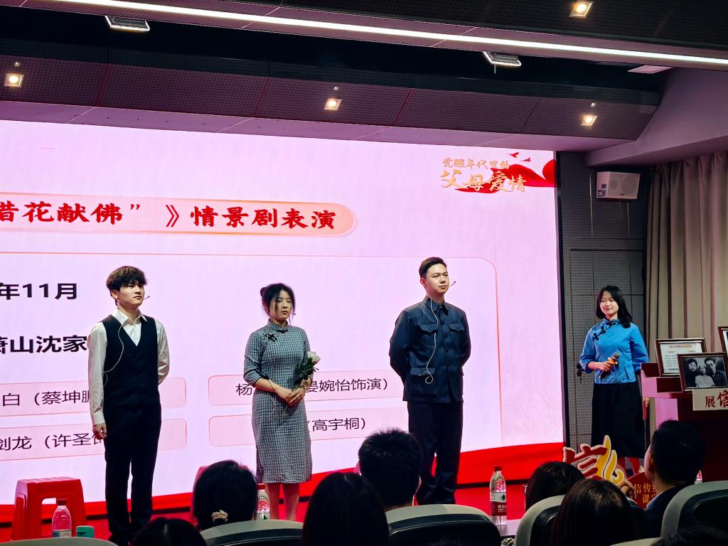 在情景演绎环节,蔡坤鹏、晏婉怡、高宇桐等同学通过《“借花献佛”》情景剧生动再现了瞿秋白、杨之华、沈剑龙三人谈判并践行开放、平等的新式婚恋观的场景;许圣、尹家荣等同学通过情景剧《最后的黎明》还原了国民党劝降瞿秋白,但他宁死不屈壮烈牺牲的场景,真挚的情感和精湛的演技,感人至深的内心独白和生动鲜活的人物形象将革命先辈们的英勇事迹和崇高精神展现得淋漓尽致,引起在场师生强烈情感共鸣。