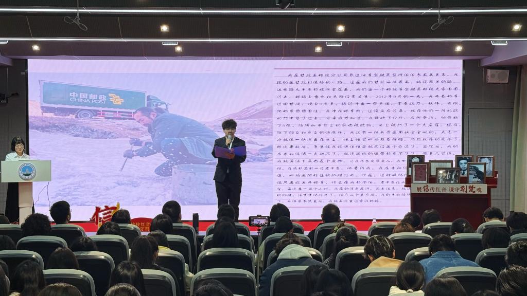 “今天,还有像交通员一样的人吗?”书信品读环节,李晨睿声情并茂地分享了“最美奋斗者”其美多吉的雪线邮路故事,号召青年学子赓续奉献精神,厚植家国情怀。