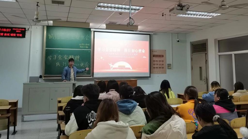 各支部围绕主题纷纷开展了“学党史,强信念,跟党走”的专题组织生活会,就“共青团员不信仰宗教”、民族团结工作和考试诚信等内容进行了主题教育活动。21级两个支部采取ppt宣讲、有奖问答等多种形式学习了十九届六中全会精神,并普及了我国关于宗教的相关政策以及法律法规;20级两个支部开展了对七一讲话精神和五四讲话精神的理论学习,倡导同学们深入实践活动;18级两个支部举行了唱团歌重温入团誓词的活动,提高了青年团员对加强民族团结工作的重要性的认识,要求团员要自觉践行爱国主义和社会主义核心价值观;研究生支部在考试诚信教育活动中提倡同学们树立诚信为本,严谨求学的态度,促进公司的学风以及校风建设。