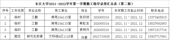 因工作需要,经员工本人申请,公司审核,现将公司2021-2022学年第二学期勤工助学拟录用名单(第二批)公示如下: