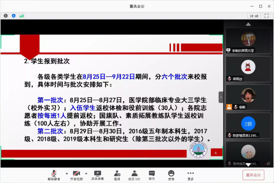 8月22日-8月23日,辅导员李敏老师分两场组织了本次主题班会,2019级本科生及2018级、2019级研究生参与其中。李老师重点强调了员工开学前的准备工作和返校后的注意事项,提醒大家高度重视疫情防控,充分准备个人防护用品、遇到困难问题及时沟通等。