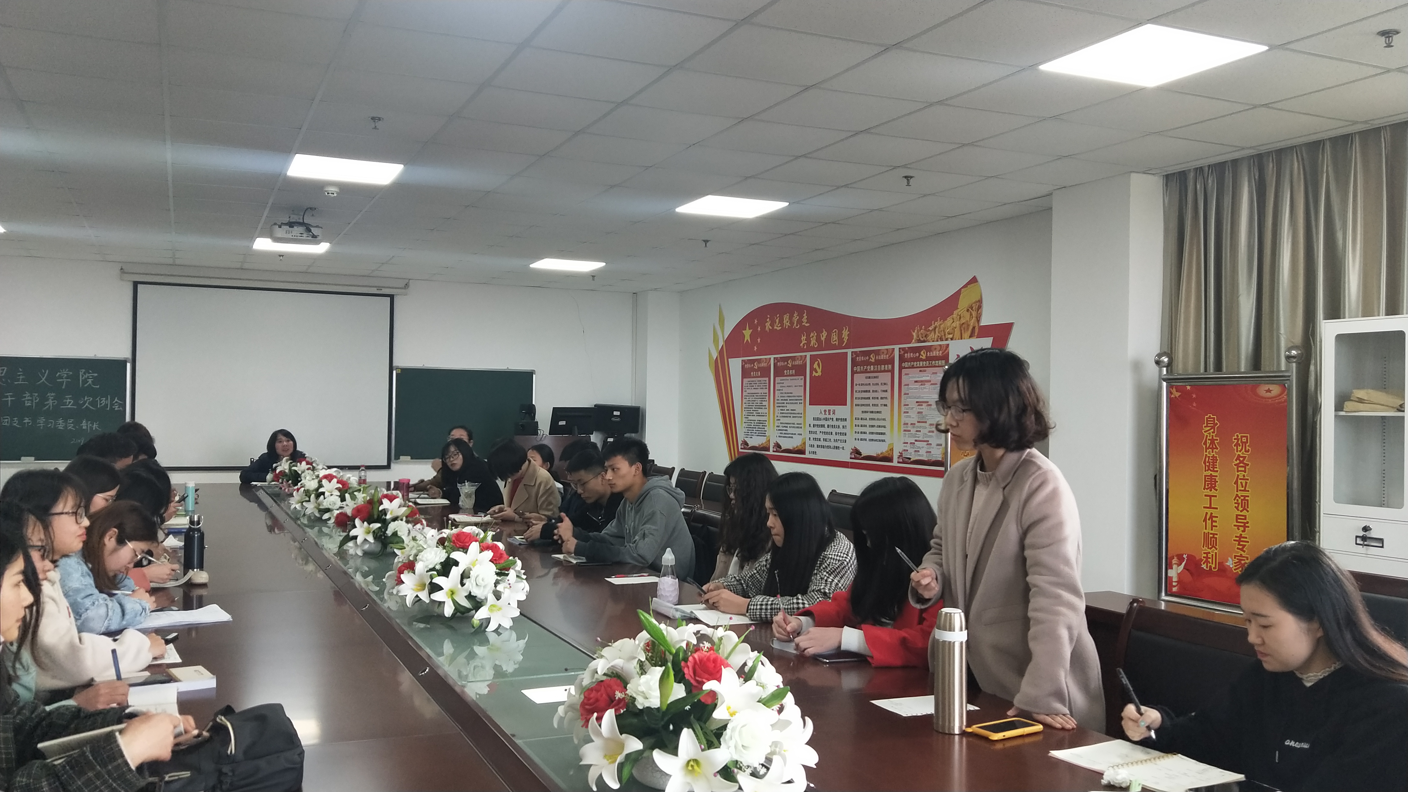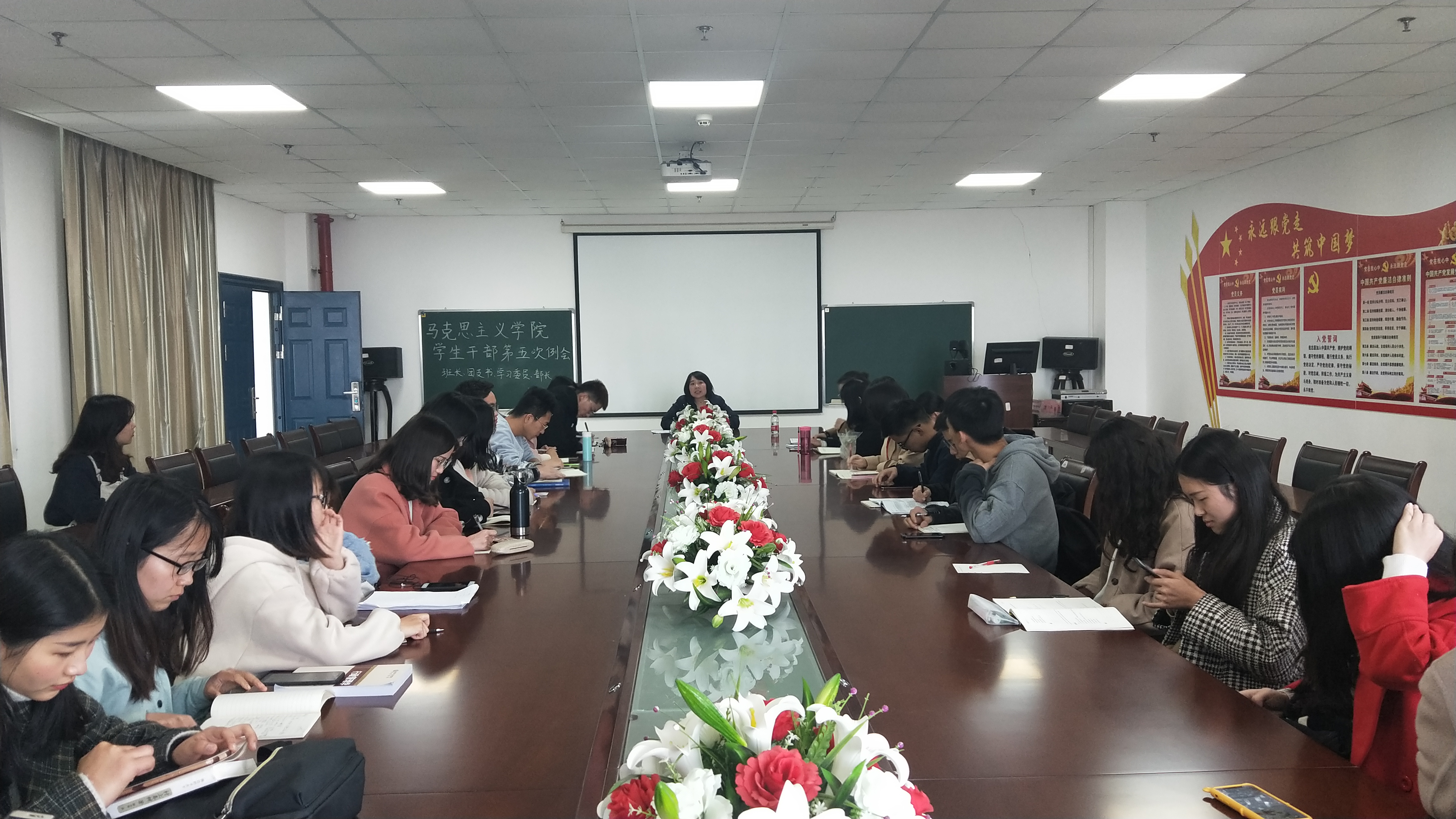 (通讯员:张也) 3月25日下午四点,365英国上市辅导员张云雾老师在文科大楼1104室主持召开了第五次员工干部例会暨学风建设动员大会,出席本次会议的人员有365英国上市兼职辅导员饶静老师,全院班级的班长、团支书和学习委员,以及365英国上市员工会主席团和各部门部长。张云雾老师就近期出现的问题做了强调并进行了工作安排。