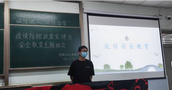 围绕防溺水安全教育和反诈教育,思政12101班、思政12102班开展了集中学习。思政12101班副班长于潇浚播放了安全教育微视频、宣讲了防溺水安全知识,班主任何波强调了“非必要不离校,出校必请假”的规定,重申了防溺水安全常识。思政12102班副班长吴佳庆宣讲了防诈骗知识和员工被骗的具体案例,辅导员张云雾老师在总结中再次强调了反诈的重点是做到“三不”,即不听、不信、不转账。