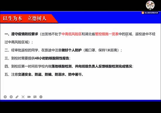 8月22日,张云雾老师和李敏老师分别召开了高年级返校主题班会。会议伊始,张老师为同学们详细解读秋季开学预通知,并对员工报到前的准备工作进行阐述。战“疫”时不我待,坚持就是胜利,张老师结合当前疫情形势带领同学们共同学习《新型冠状病毒肺炎防控方案(第九版)》,厘清高中低风险地区的概念与区别。而对于安全问题她强调:“在返校过程中,要遵守疫情防控要求,注意交通安全、防盗、防骗、防溺水、防中暑,要始终把安全作为头等大事。”李敏老师重点宣讲了研究生返校注意事项。