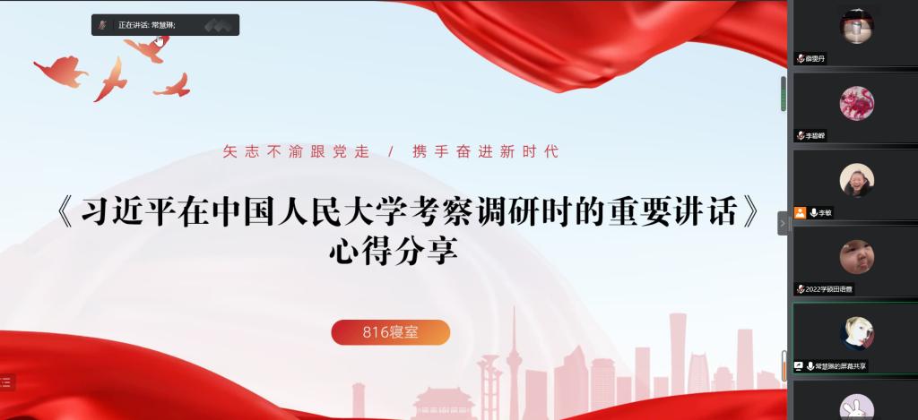 618寝室代表常慧琳同学从中国人民大学的创建历史出发,带领大家重温《习近平在中国人民大学考察调研时的重要讲话》,并就教育的根本问题、高校在教育中的作用、思政课的本质和培养教师队伍四个方面作了详细解说。分享最后她对同学们发出号召:“作为青年员工,我们要自觉、自省、自励、勤学、明辨、笃行,努力学习,提升理论素养、强实践锻炼、掌握过硬本领、用心感应时代脉搏,将青年使命贯穿学业”。