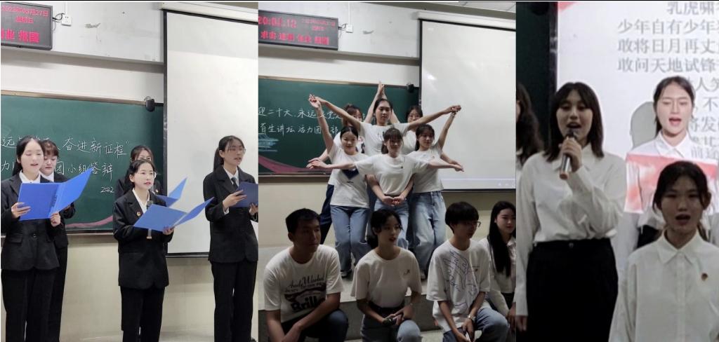 活力团小组的优秀展示,赢得掌声雷动,在热烈的掌声中活力团支部答辩拉开帷幕。“敢将日月再丈量,今朝唯我少年郎”12101团支部从生活、思想、社会实践三方面建设班级积极文化,新时代路上,支部团员奋发图强携手同行;高擎的团旗履行着责任,飘扬的团旗昭示使命,青春行之不悔、使命不至不归,这是12102团支部的坚定信念;12001团支部团员从五湖四海而来,相聚一起,同呼吸共奋斗,党旗所指就是团旗所向,坚定不移跟党走,谱写新时代青年奋斗华章;初心不改跟党走,时代新篇见担当,12002团支部从制度、思想、文化建设班级,每一位团员都是夜空中最亮的星,一起向未来进发。
