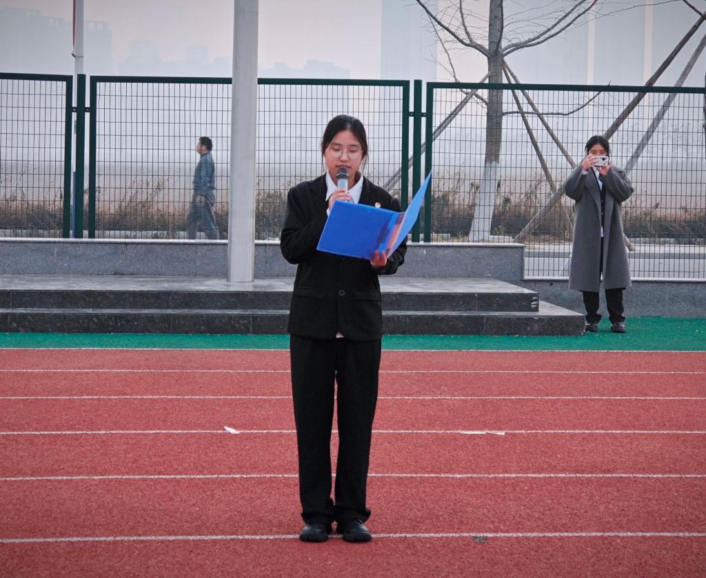 思政12201班学习委员秦雯婧在国旗下发表演讲。作为国家励志奖学金的获得者,她分享了保持优异学习成绩的经验做法,号召同学们遵规守纪、诚信应考。