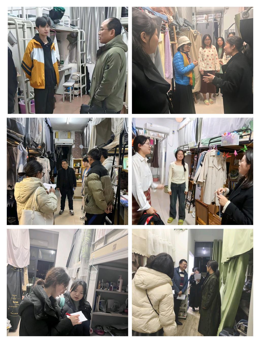 走访过程中,老师们与同学们进行了亲切的交流,了解近期学习与生活情况,并着重强调宿舍安全的重要性,提醒同学们遵守宿舍安全规定,增强安全防范意识。在走访毕业生寝室时,刘小燕贴心提醒同学们在专心备考的同时也要注意天气变化,做好保暖措施,在研究生备考的冲刺阶段,保持良好的身心状态。思政12101班赵金铭说到,“老师们的叮嘱让人觉得心里暖暖的,复习备考都更有劲儿了!”