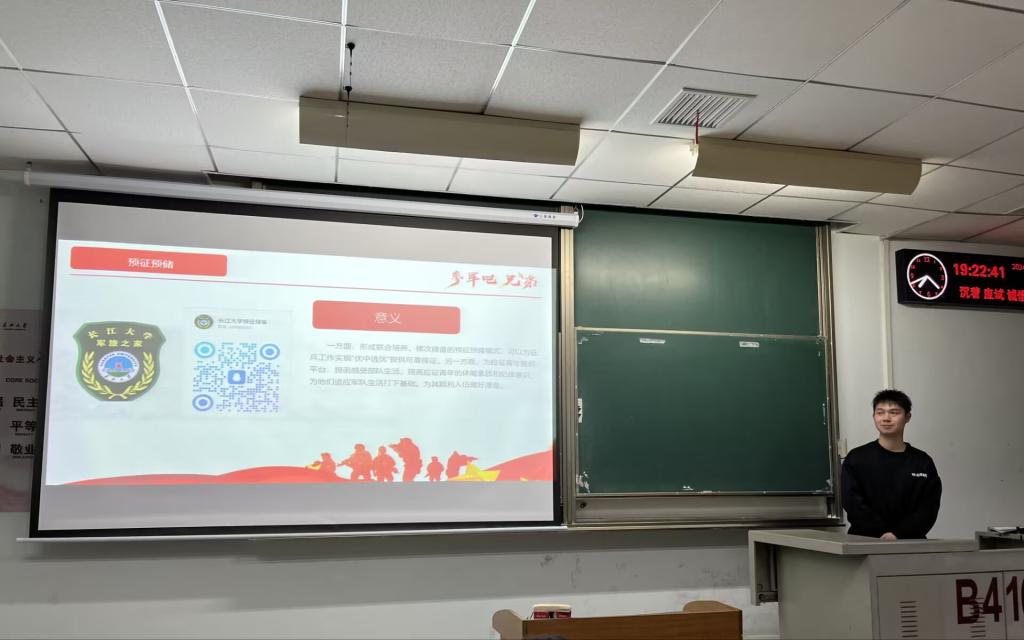 会议伊始,蔡坤鹏以“青春”设问,启发同学们深刻思索青春价值。随后,他从多维度详细分享军旅经历,生动展现军旅生活的多元魅力。在政策解读环节,蔡昆鹏着重强调征兵的重大意义,突出“民无兵不安,国无防不利”理念。紧接着,他精准解读征兵基本流程,包括入伍、身体及政治条件等要求,从初审初检直至预定新兵各环节均予以细致说明。同时,他全面阐释参军优惠政策,如复学升学、学费补偿代偿、退役就业扶持等。