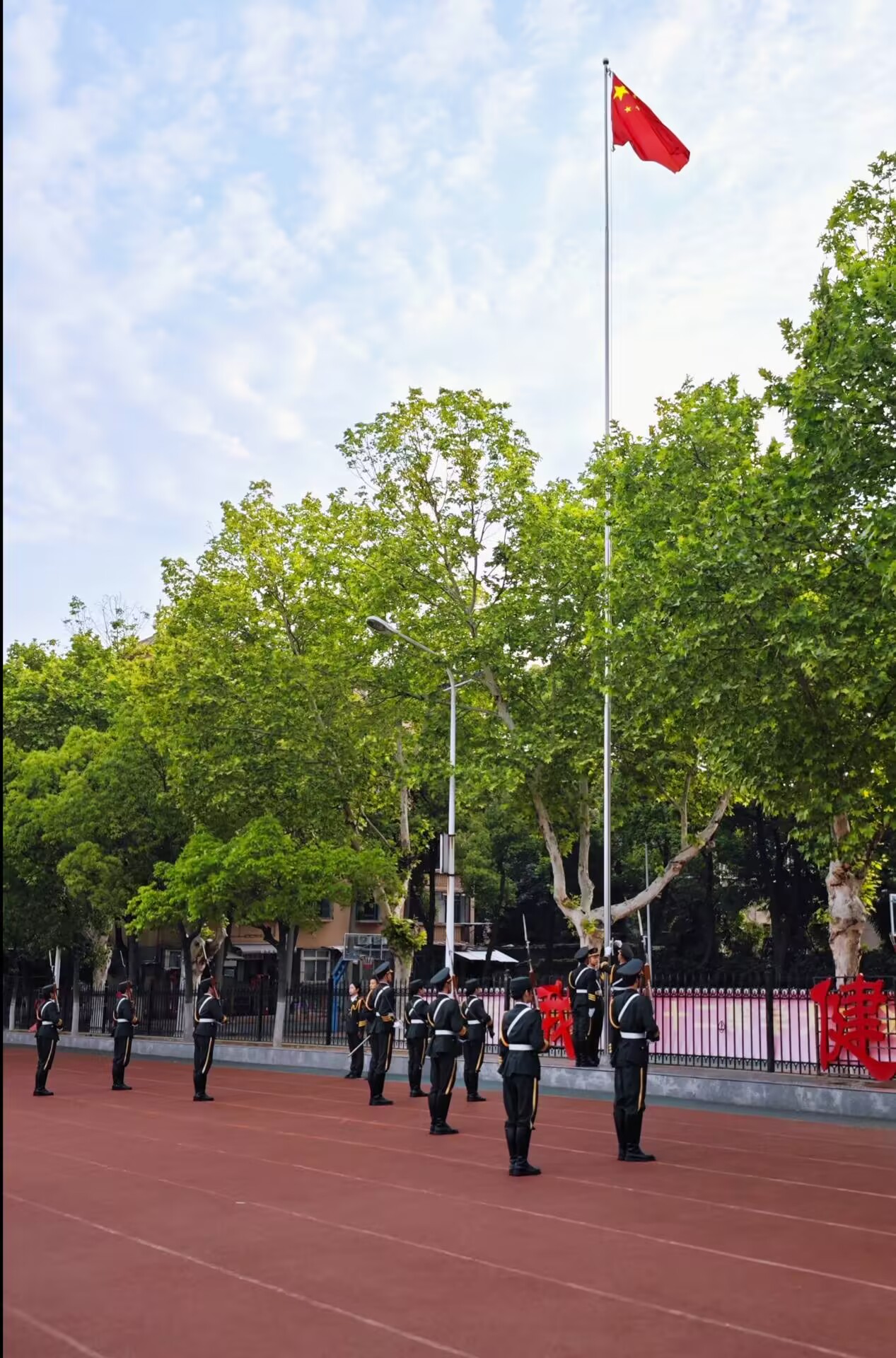 全体师生行肃穆礼,齐唱国歌,注视着国旗冉冉升起。