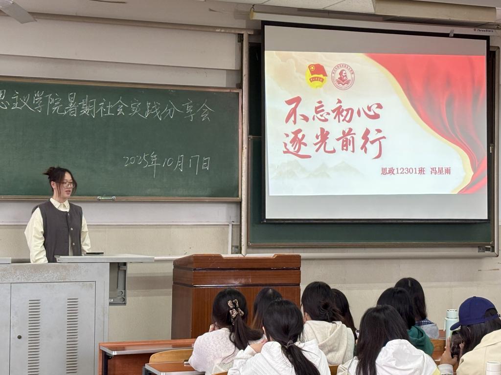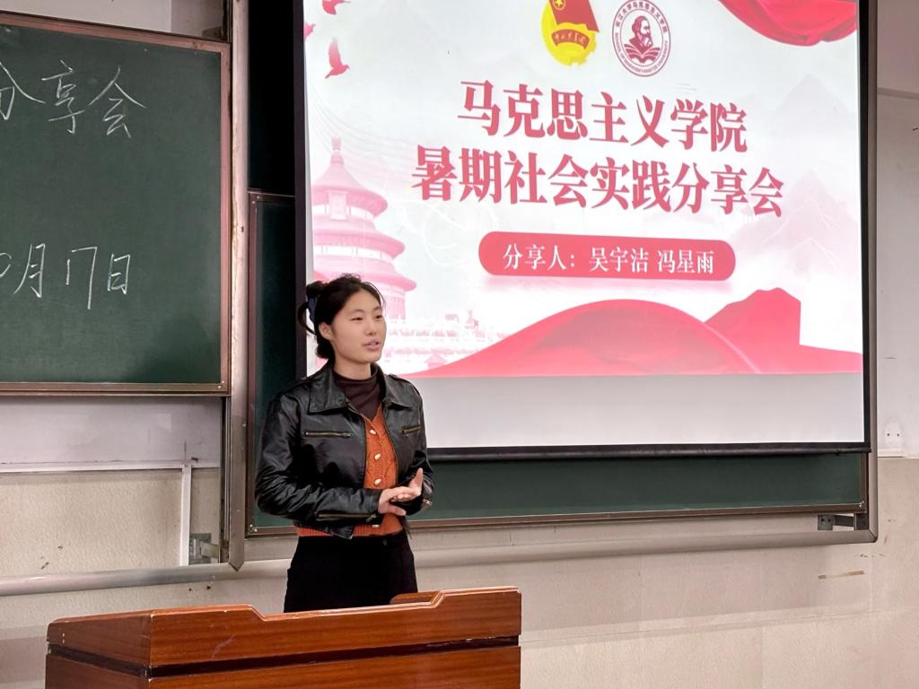 分享会上,吴宇洁首先介绍了自己参与的多项暑期社会实践:公司“信·荆楚”团队赴攀枝花、成都、重庆开展“寻信解信”活动;第十九期校青马班的湖南红色研学行;2025年全国老员工暑期社会实践专项行动。她还结合自身,分享了理论宣讲、制作团课、体验红军生活等经历的意义,鼓励学弟学妹主动参与社会实践,将专业素养与实践结合,明确自身定位,勇担新时代青年责任。