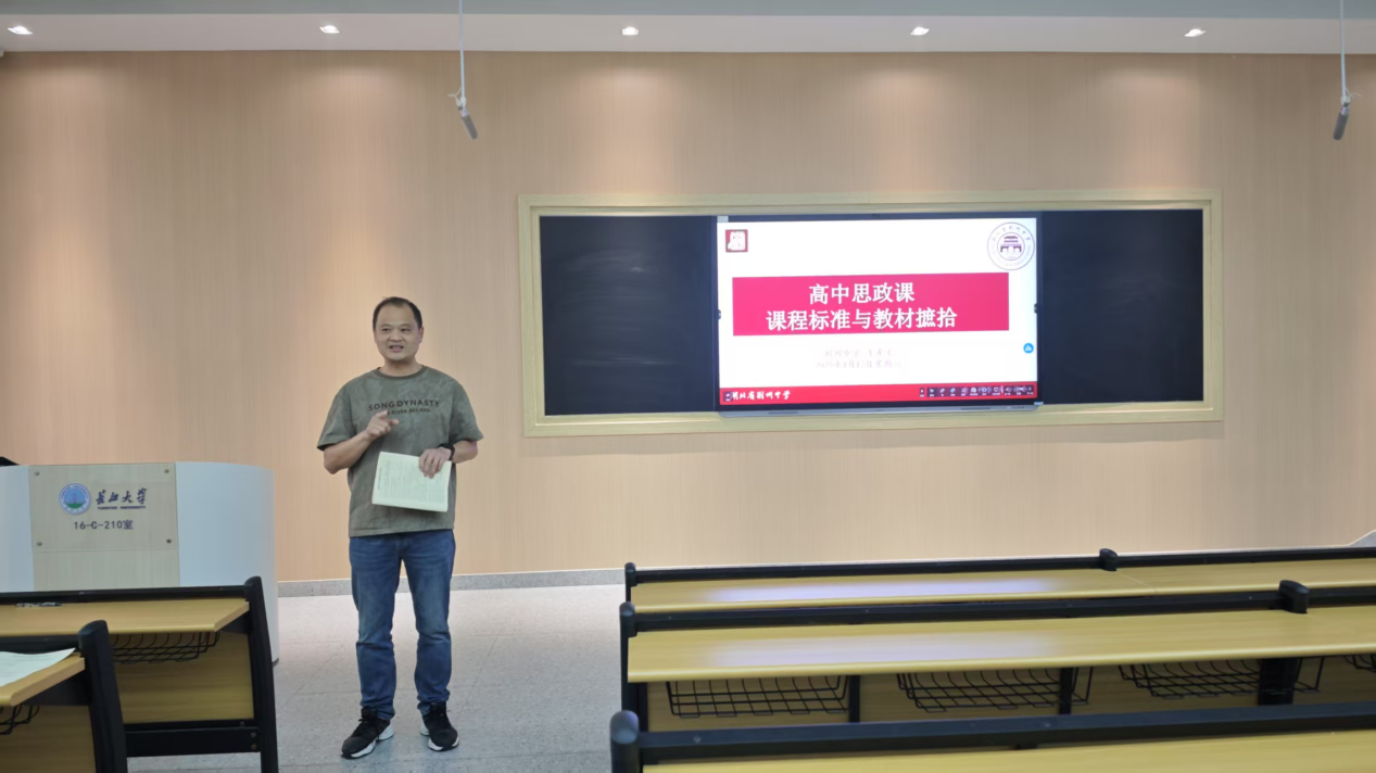 4月12日上午16教C210教室,王老师以“选思政 练内功 看课标”为切入点,从当下塑造立德树人新格局,培养担当民族复兴大任时代新人的时代要求出发,引导同学们与老师积极互动,激发了大家的思考与讨论。随后,王老师从“练内功”的教师要求展开,和同学们分享思政老师的必备要求,从塑造正确三观、储备多样才能、做好人生规划等方面,深入与同学们交流在当下时代要求下高中思政教师的内功要求。王老师还与员工分享自己员工时代的亲身经历,并以此为例,深入交流了时代培养需要、教师涵养内功的思考与启示。在课程标准的交流环节,王老师重点讲解了中学课程标准的内涵、重要性与具体落实方法,引导同学们更好理解与思考中学思政课程标准。