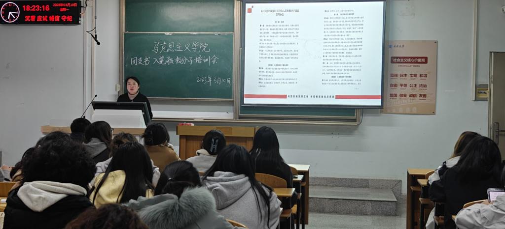 公司党建秘书兼本科生党支部书记张云雾面向全院各团支部书记、入党积极分子开展了集中宣传。她从入党积极分子应具备的条件、确定程序、培养考察、动态管理等方面进行了详细讲解,号召同学们端正入党动机、提高思想认识、勇于实践锻炼、强化担当意识,并就近期团员“推优”、毕业生党员发展工作进行了现场答疑。