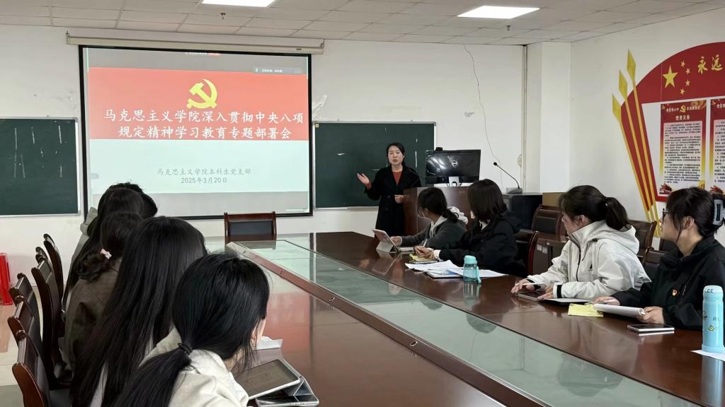 重温入党誓词、交纳本月党费、学习《中国共产党章程》(第四章)后,杨新玉同志领学了习近平总书记关于深入贯彻中央八项规定精神学习教育的重要讲话和重要指示精神,习近平在二十届中央纪委四次全会上的重要讲话精神,以及《求是》杂志发表习近平总书记重要文章《健全全面从严治党体系》;秦雯婧同志领学了2025《政府工作报告》、2025年全国教育工作会议精神、2025年全省教育大会精神以及湖北省“新春第一会”精神等重要会议精神;王诗媛同学领学了中共中央办公厅印发《全国党员教育培训工作规划(2024—2028年)》等内容。党支部书记张云雾传达学习了公司2025年度工作部署会、校纪委二届五次全会等公司相关会议精神,结合支部实际启动部署深入贯彻中央八项规定精神学习教育工作,并以微党课的形式进行了深入贯彻中央八项规定精神学习教育专题辅导。