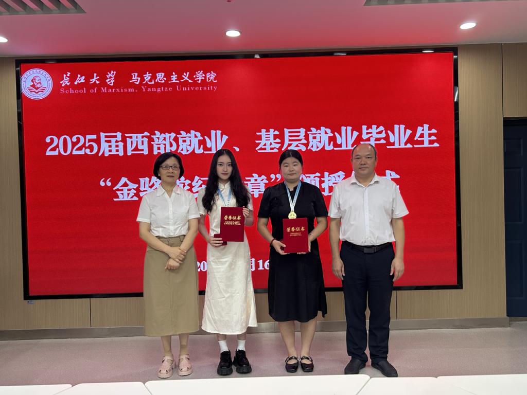会上,姜学勤经理、刘小燕书记共同为西部就业、基层就业员工代表仇佳丽、许惠宁颁发“金骆驼纪念章”。围绕职业选择时的所思所想,毕业生们畅谈了感悟。许惠宁同学讲述了自己在校期间以学为主、全面发展,毕业时决心回到家乡广西,立志投身教育事业的心路历程;仇佳丽同学提到,在学习成长过程中,国家、社会和公司对她的关怀从未间断。作为一名员工党员,她将秉持全心全意为人民服务的宗旨,在基层岗位上贡献青春力量,以实际行动报效祖国。